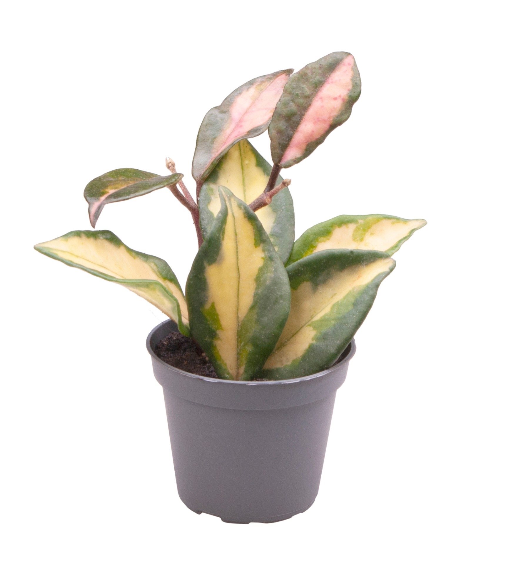 The oval-shaped leaves of Hoya carnosa ‘Tricolor’ are small and have a pink hue.